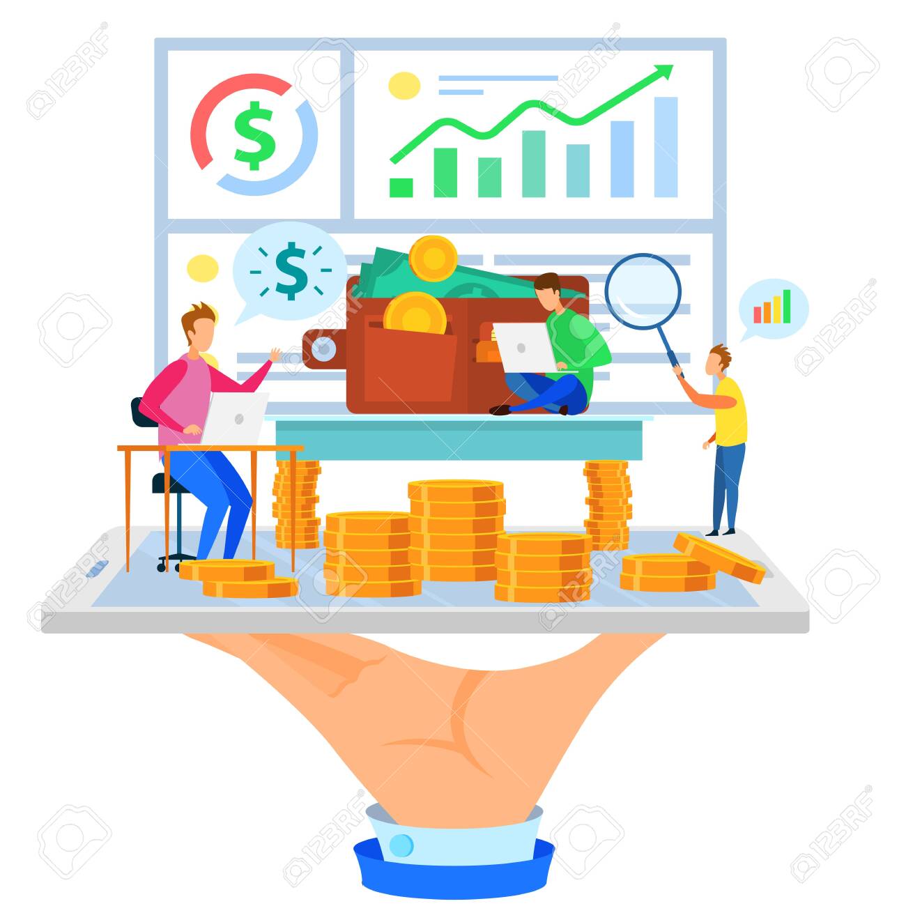 growing-income-graph-vector-illustration-hand-coins-stacks-simple-modern-flat...
